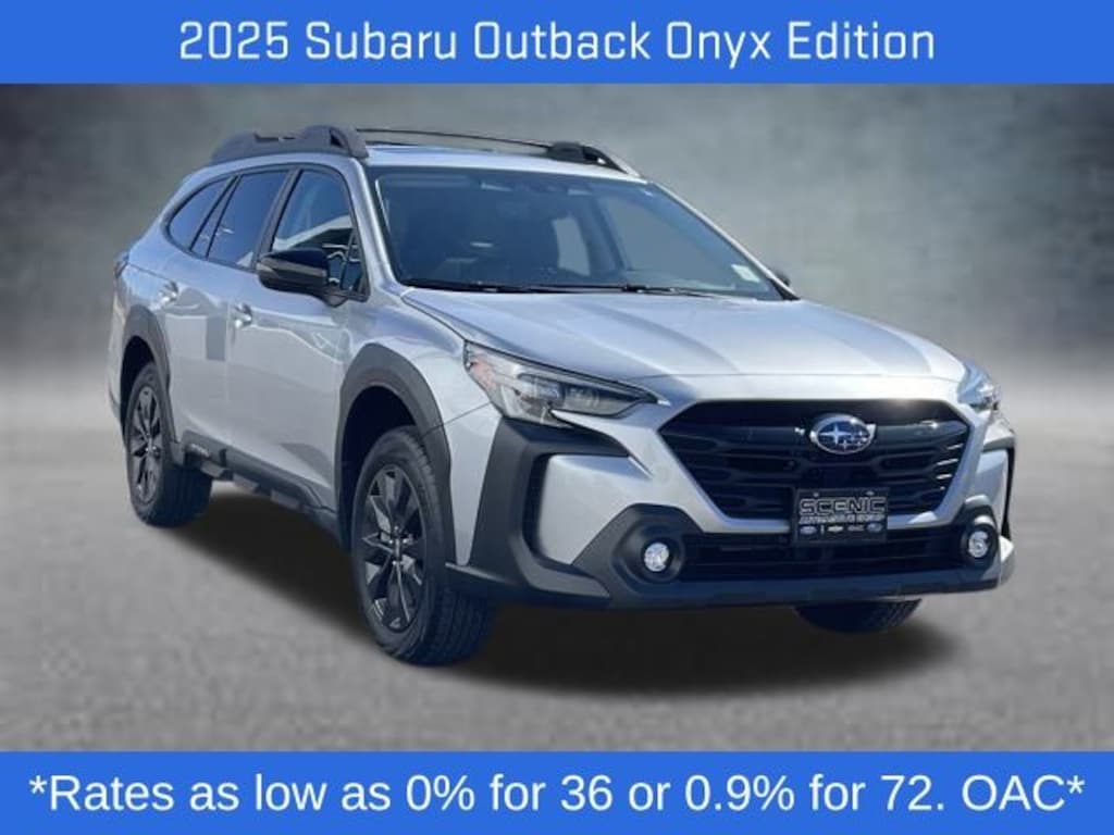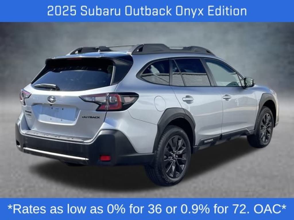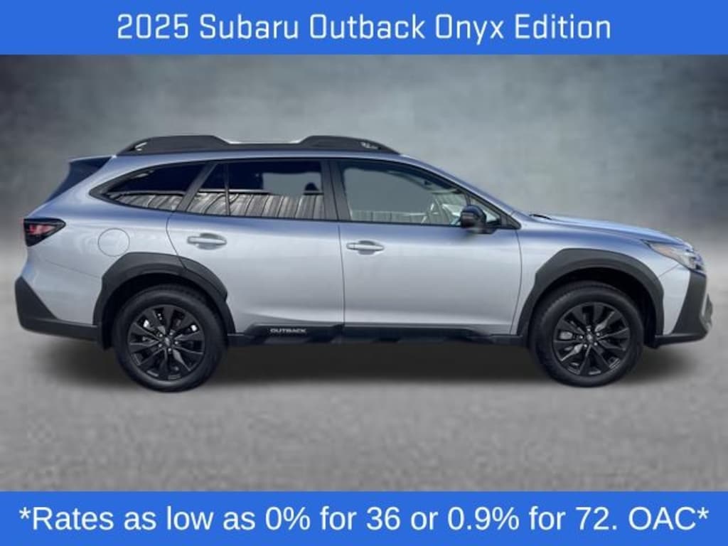 The exterior is finished in a stylish Ice Silver, while the interior features durable Gray cloth seats, offering a blend of practicality and comfort. The Onyx Edition trim enhances the Outback with unique blacked-out design accents, adding a distinctive look to its already capable frame.